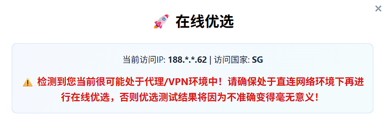 CN环境下,将不被允许使用在线优选功能,因为在代理环境下进行在线优选只会得到你代理的优选,选出来的地区基本上都是你代理所属地区,而延迟也是你代理延迟,可以说是毫无意义的。 - 如果你是身处国外并且直连尝试在线优选,也毫无意义,因为也就只有在