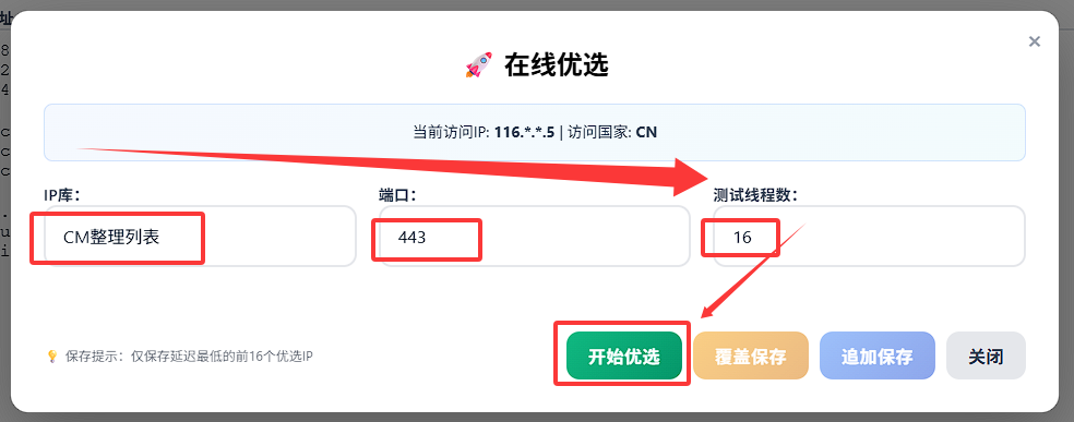 CF官方列表,推荐使用CM整理列表即可,该列表包含了大部分三网优选IP段,且会不定期更新维护; - 端口:默认为